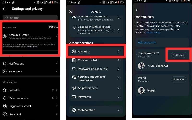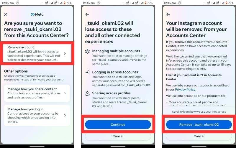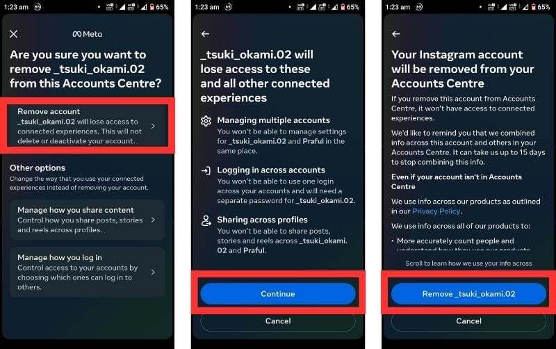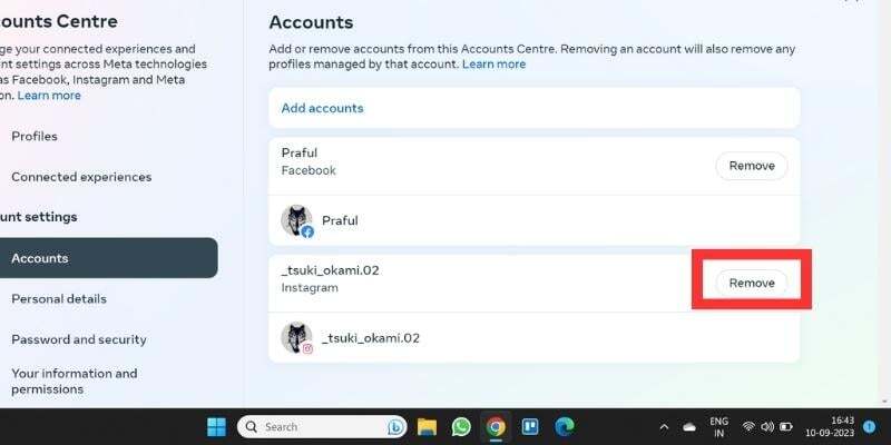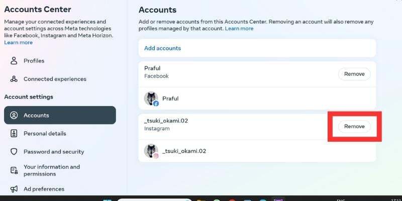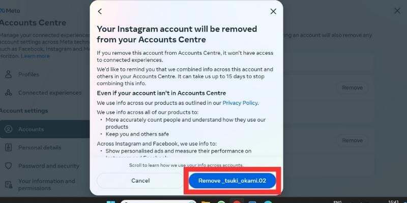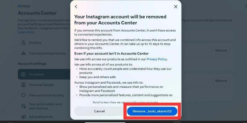 8단계: 마지막으로 제거를 클릭하여 Facebook과 Instagram 계정의 연결을 해제합니다.