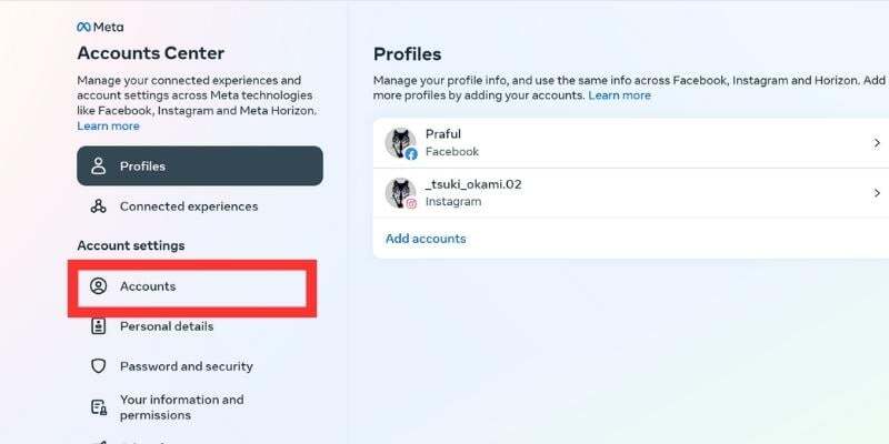 4단계: 화면 왼쪽에 있는 메타 계정 센터 로 이동합니다.
