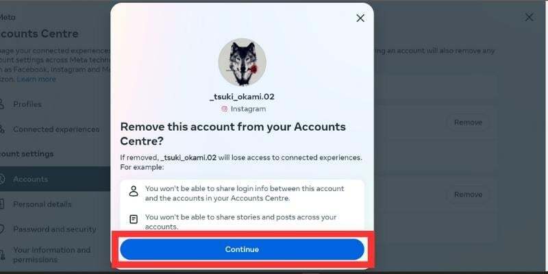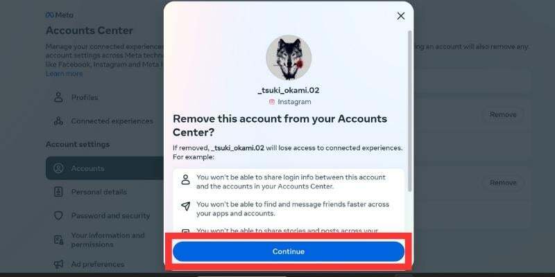 9단계: 확인 창이 나타납니다. 제거를 클릭하면 Facebook과 Instagram 계정의 연결이 해제됩니다.