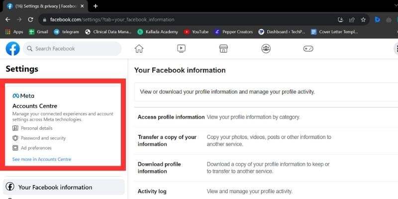 5단계: 컴퓨터 화면 왼쪽에 있는 메타 계정 센터 로 이동합니다.