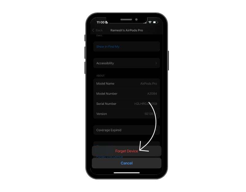 - 변경 사항을 확인한 후 장치 잊어버리기를 클릭하여 AirPod를 재설정하세요.