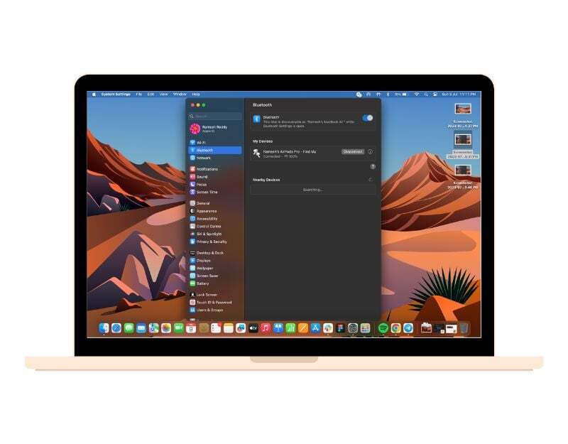 - AirPods가 Mac에 연결되면 Bluetooth 기기 목록의 맨 위에 표시됩니다. 이제 추가 설정에 액세스하려면 i 버튼을 클릭하세요.