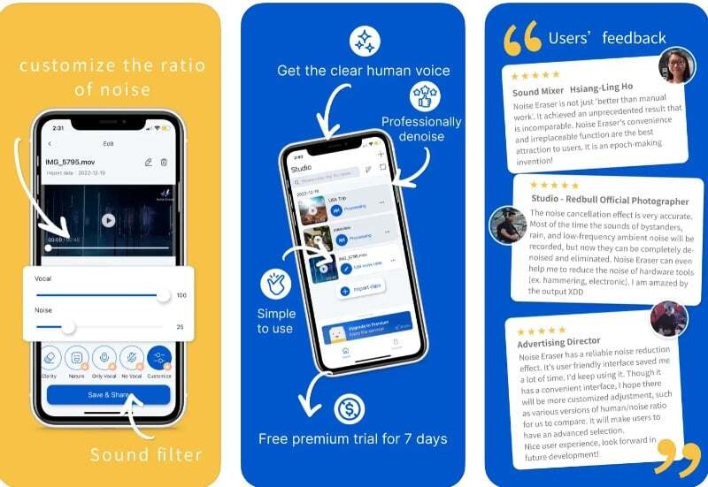 Noise Eraser는 콘텐츠를 제작할 때 iPhone 및 Android에 가장 적합한 옵션입니다. 이 앱은 영상에서 노이즈를 제거하는 다양한 기능을 제공합니다. 또한 사람의 목소리를 다른 소음과 분리하는 기능도 있습니다. 간단하고 사용하기 쉬운 인터페이스는 물론 무료 및 유료 버전도 있습니다. 이 앱은 콘텐츠 제작자와 동영상에서 자신의 목소리를 향상시키려는 사람들에게 가장 적합합니다.