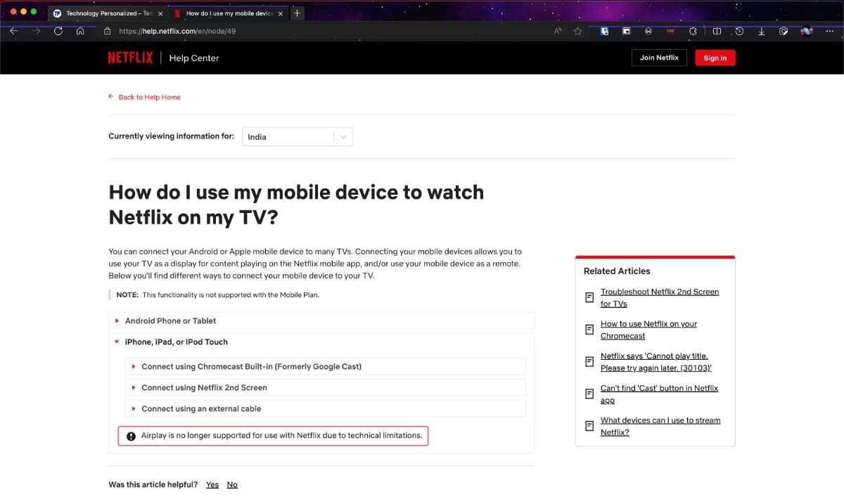 AirPlay는 기술적으로 iPad, iPhone 또는 Apple TV에서 Mac으로 모든 것을 스트리밍할 수 있지만 Netflix에는 특정 제한 사항이 도입되었습니다. 2019년 4월 Netflix는 AirPlay에 대한 지원을 중단했습니다. 이는 회사가 사용 중인 장치 유형을 감지할 수 있는 수단을 가지고 있어 시청 표준이 달라질 수 있다는 점을 들었습니다. 넷플릭스 홈페이지 에도 이 내용이 명확하게 언급되어 있습니다.