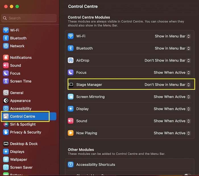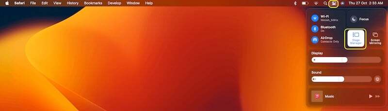 이제 메뉴 표시줄 에 스테이지 관리자를 배치했으므로 메뉴 표시줄(macOS 데스크탑의 오른쪽 상단)로 가서 거기에 있는 제어 센터 아이콘('동등 기호'처럼 보이는 아이콘)을 클릭하세요. 스테이지 관리자 옵션이 표시됩니다. 계속해서 선택하세요.