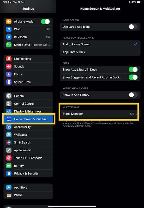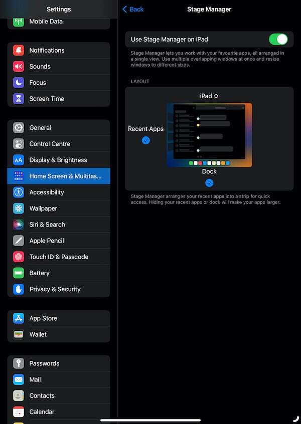 설정에 들어가면 홈 화면 및 멀티태스킹 섹션이 나올 때까지 아래로 스크롤하세요. 이를 선택하는 순간 디스플레이 오른쪽의 이 섹션에서 사용 가능한 옵션이 표시됩니다. 우리는 마지막에 무대 매니저를 찾고 있습니다. 기본적으로 꺼져 있습니다. 켜려면 탭하기만 하면 됩니다.