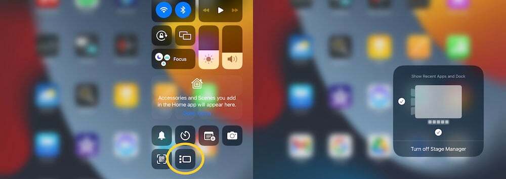Stage Manager에 익숙하다면 iPad의 제어 센터 에서 이를 호출할 수도 있습니다. 오른쪽 상단에서 아래로 스와이프하여 제어 센터에 액세스하면 사용 가능한 옵션 중 하나로 스테이지 관리자가 표시됩니다. 활성화하려면 탭하세요.
