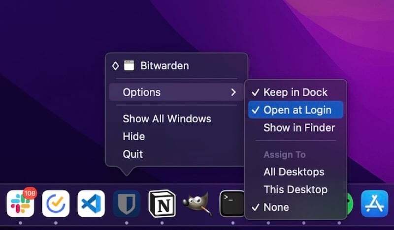 시작 시 실행을 방지하려는 앱이 현재 Mac에서 실행 중이거나 Dock에 고정되어 있는 경우 몇 가지 간단한 단계를 통해 쉽게 비활성화할 수 있습니다.