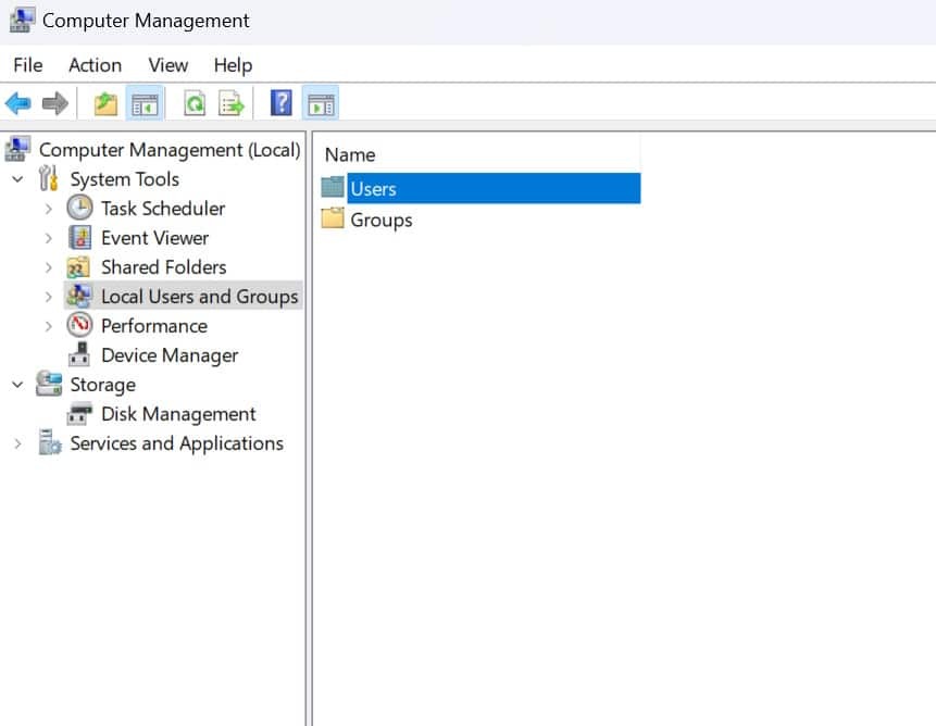 2. 왼쪽 창에서 "로컬 사용자 및 그룹" 옵션을 확장하고 "사용자"를 선택합니다.