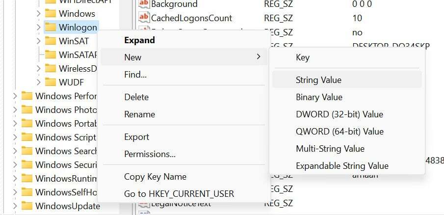 6. 그런 다음 왼쪽 창에서 Winlogon을 마우스 오른쪽 버튼으로 클릭하고 새로 만들기 > 문자열 값을 선택합니다 그러면 사용자 이름에 대한 항목이 생성됩니다.