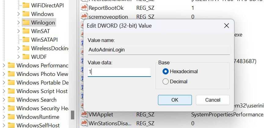 5. 이제 두 번 클릭하여 AutoAdminLogin을 열고 값을 0에서 1로 변경합니다. 확인을 클릭하여 변경 사항을 저장합니다.