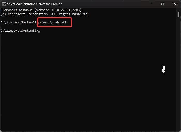 - 명령 프롬프트 창에서 powercfg -h off를 입력 하고 Enter 키를 눌러 명령을 실행합니다.