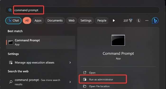 - 상자에 명령 프롬프트를 입력 하고 관리자 권한으로 실행을 선택하여 PC에서 관리자 권한으로 명령 프롬프트를 엽니다.