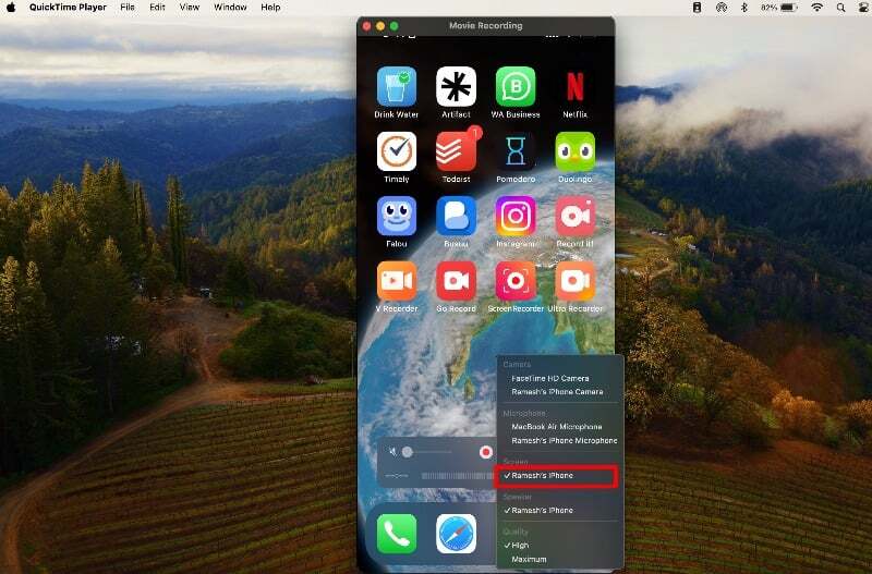 - 빨간색 녹음 버튼 옆에 있는 화살표를 클릭하고 옵션에서 iPhone 화면을 선택하세요. 오디오 소스와 품질을 선택할 수도 있습니다.