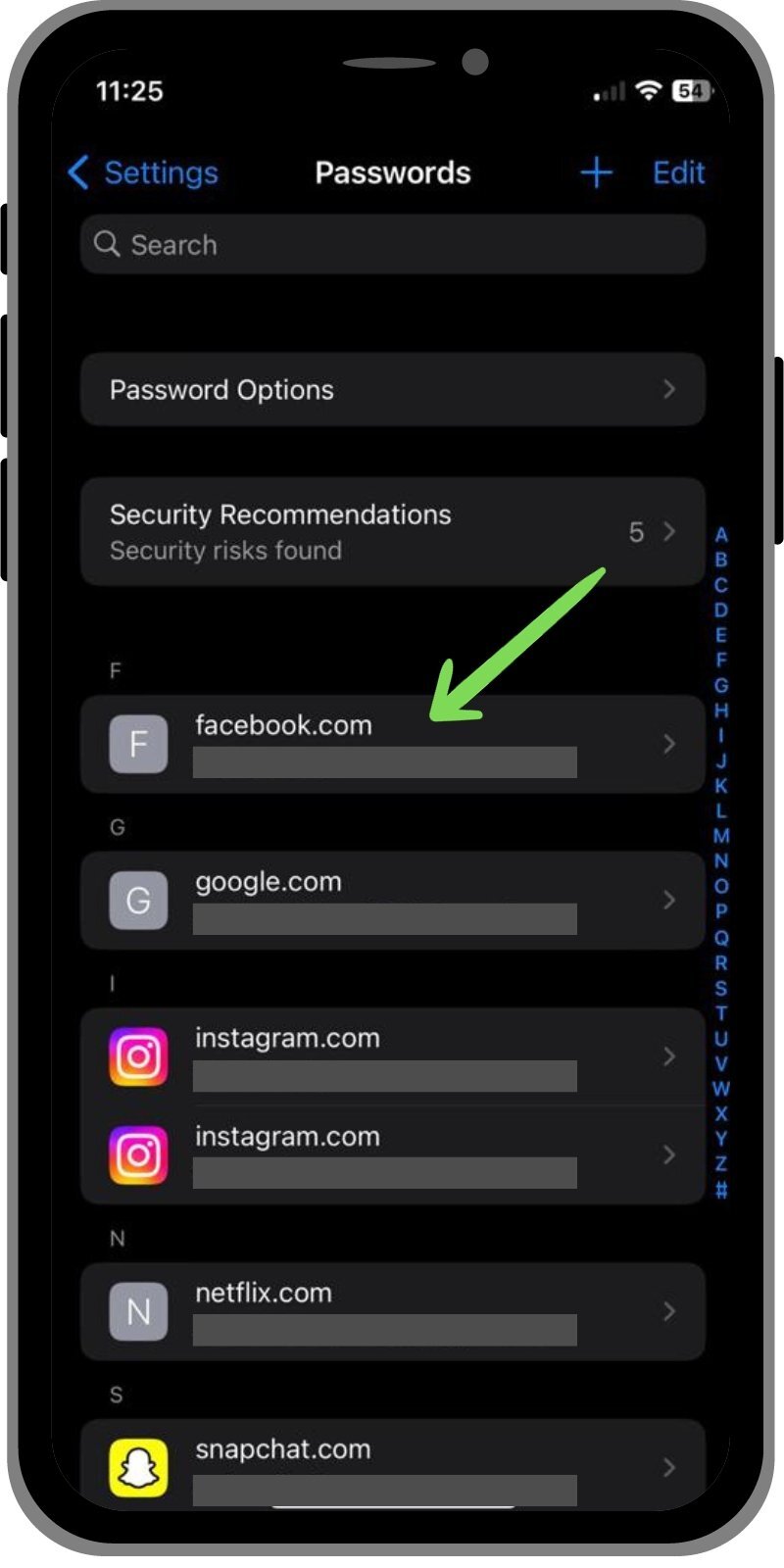 - iPhone에 저장된 모든 비밀번호 목록이 표시됩니다. 이제 검색하려는 비밀번호를 탭하세요.