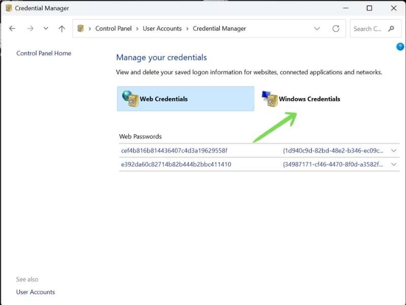- 이제 자격 증명 관리자 로 이동합니다 여기에는 웹 자격 증명 과 Windows 자격 증명 이라는 두 가지 옵션이 표시됩니다 웹 자격 증명은 웹 사이트의 암호를 저장하는 반면, Windows 자격 증명은 데스크톱 응용 프로그램 및 Windows 프로그램의 암호를 저장합니다.