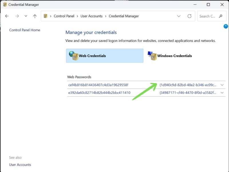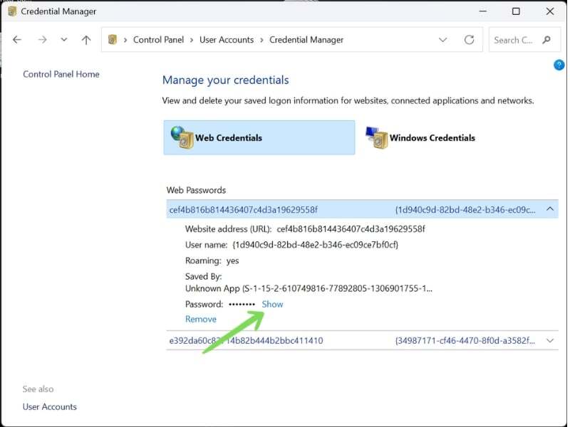 - 해당 섹션(웹 자격 증명 또는 Windows 자격 증명)으로 이동하여 검색하려는 비밀번호 옆에 있는 드롭다운 버튼을 클릭하세요.