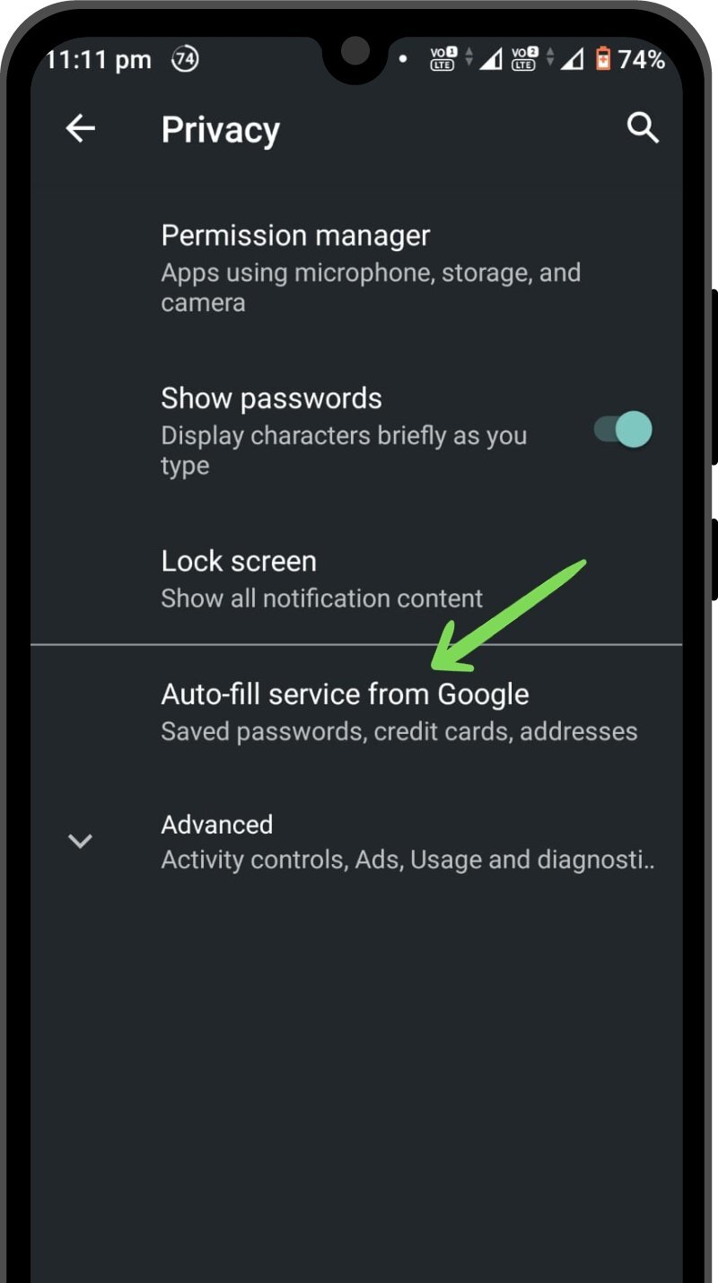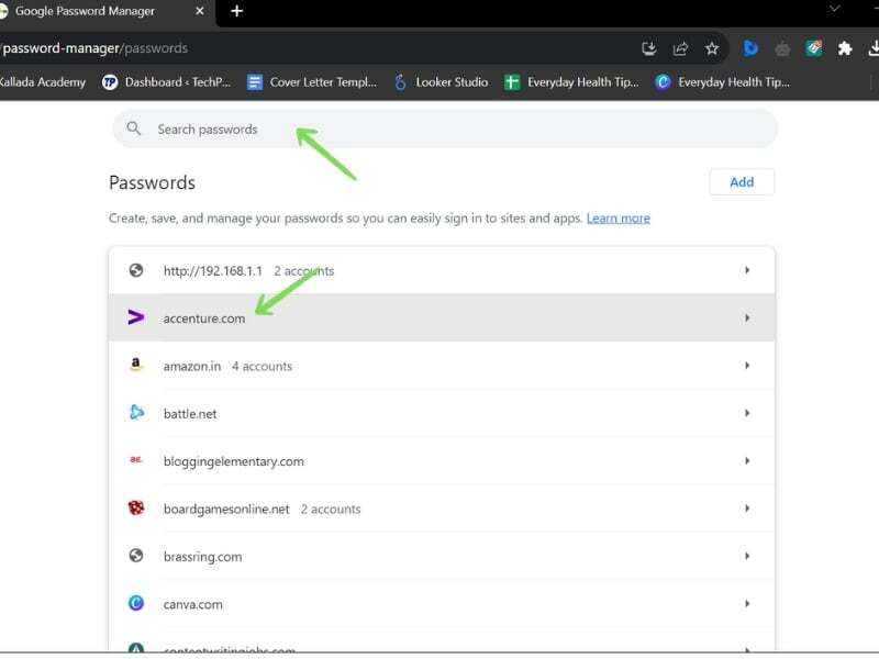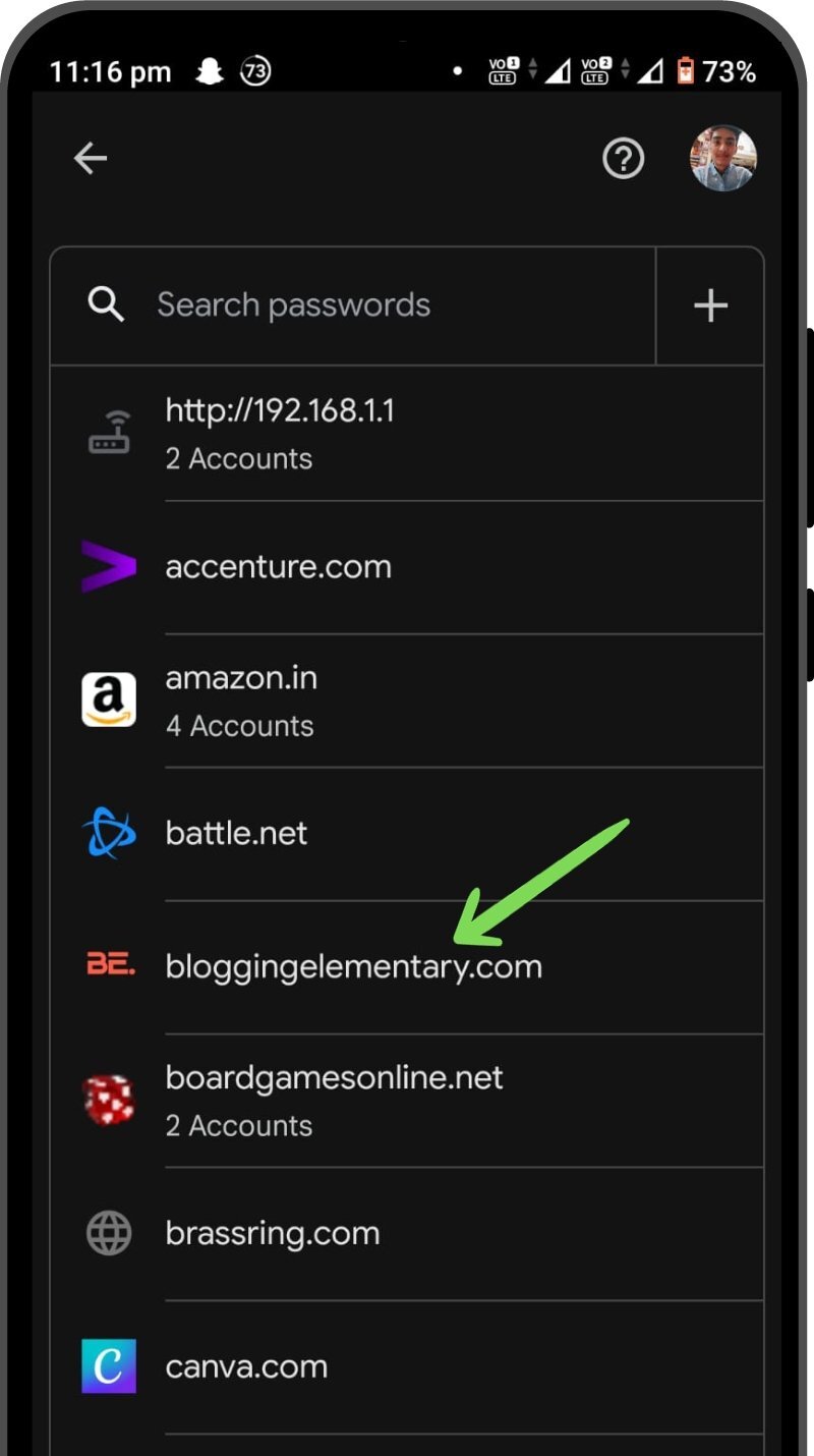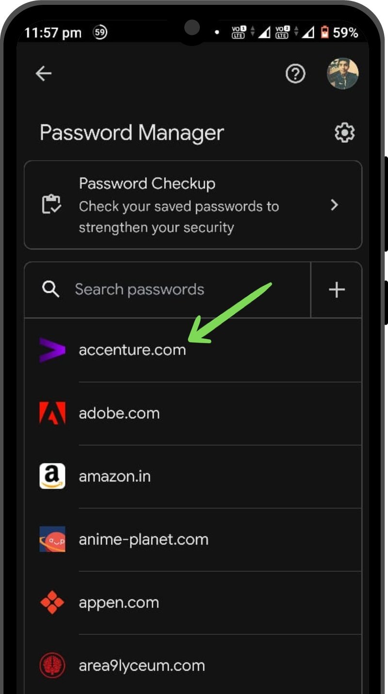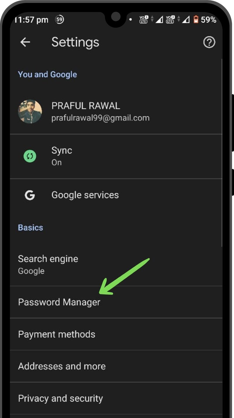 - 이제 비밀번호를 탭하세요 그러면 Google 계정과 연결된 비밀번호 관리자가 열립니다. 아래로 스크롤하여 저장된 비밀번호를 찾거나 검색창을 사용하여 특정 비밀번호를 찾을 수 있습니다.