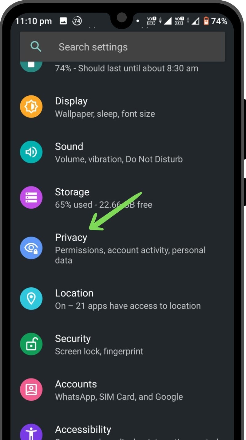 - 아래로 스크롤하여 개인정보 보호 를 찾습니다