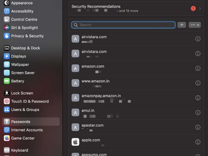 - 아래로 스크롤하여 저장된 비밀번호를 찾거나 검색창을 사용하여 특정 비밀번호를 찾을 수 있습니다.