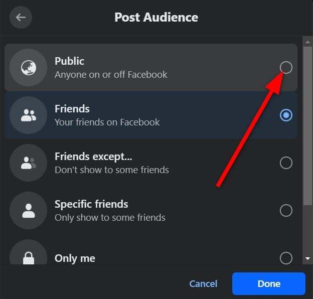 - 적절한 옵션을 선택하여 친구가 게시물을 볼 수 있도록 허용하거나, 특정 친구가 게시물을 볼 수 없도록 차단하거나, 게시물을 공개하도록 설정하는 등의 작업을 선택할 수 있습니다. 우리의 경우에는 Public 을 선택합니다