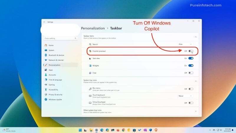 Windows 11에서 코파일럿을 제거하는 첫 번째 단계는 작업 표시줄에서 아이콘을 제거하는 것입니다. 그러나 Windows 11에서는 Copilot이 비활성화되지 않는다는 점을 명심해야 합니다. 이는 사용자에게 표시되지 않도록 작업 표시줄에서 제거하는 방법일 뿐입니다. 하지만 원하는 경우 키 조합(Win+c)을 통해 불러올 수 있습니다.