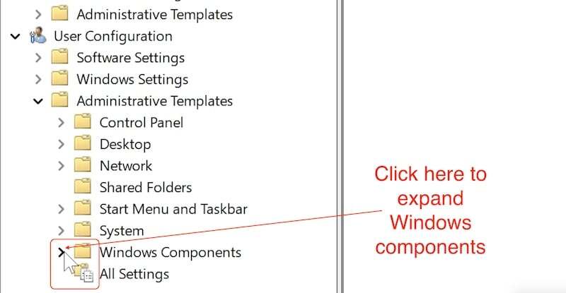그런 다음 Windows 구성 요소 옆에 있는 화살표를 클릭합니다