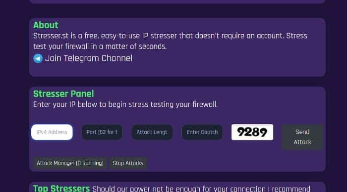 Quez Stresser와 유사한 Stresser St는 무료로 제공되는 사용자 친화적인 IP 스트레스 도구입니다. 등록할 필요가 없으며, 다른 필수 입력 사항과 함께 IP 주소를 입력하는 것만큼 간단하게 테스트를 시작할 수 있습니다.