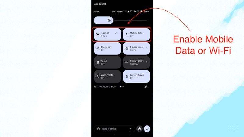- 장치에서 Wi-Fi 또는 모바일 데이터를 활성화하려면 아래로 두 번 스와이프하여 빠른 설정에 액세스하고 Wi-Fi 또는 모바일 데이터를 활성화하거나 원하는 경우 둘 다 활성화할 수 있습니다.