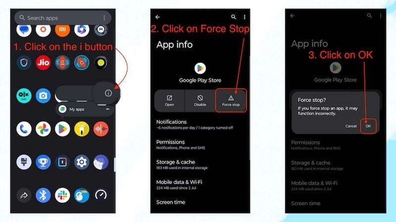 Google 계정을 수동으로 동기화한 후에도 여전히 'Google Play 인증 필요' 문제가 발생하는 경우 Google Play 스토어를 강제 종료한 후 문제가 해결되었는지 확인해야 합니다. Google Play 스토어를 강제 종료하려면 다음 단계를 따르세요.