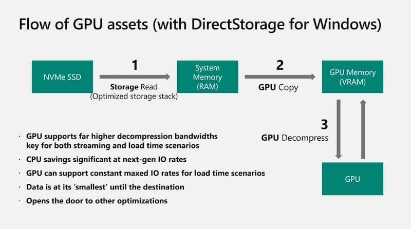 DirectStorage는 CPU에서 데이터를 압축 해제하는 대신 GPU에서 압축을 해제하는 다른 더 나은 접근 방식을 취합니다. 이로 인해 전체 데이터 흐름이 변경됩니다. 데이터는 SSD에서 시스템 메모리 또는 RAM으로 전송된 다음 RAM에서 GPU로 직접 전달되며, 여기서 GPU는 데이터의 압축을 풀고 직접 사용합니다. 이는 전체 프로세스를 훨씬 더 빠르고 효율적으로 만듭니다.