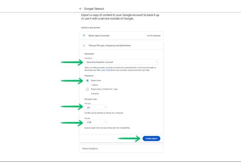 6단계: 전송 방법, 빈도, 파일 형식 및 크기를 선택합니다. 내보내기 만들기 를 클릭합니다 사진을 다운로드할 준비가 되면 이메일을 받게 됩니다.