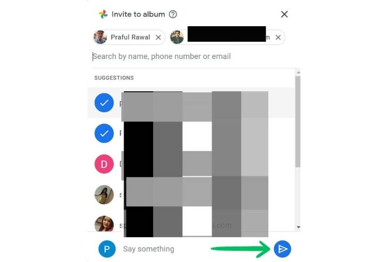 7단계: 이제 사람들을 초대하라는 메시지가 표시됩니다. 여기에 다른 Google 포토 계정의 이메일 주소를 입력할 수 있습니다. 이메일 주소를 입력하신 후 보내기 버튼을 눌러주세요.