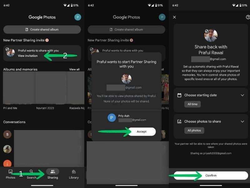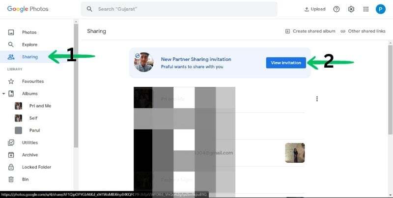 5단계: 이제 위에서 입력한 다른 Google 계정 으로 이동하여 초대를 수락합니다. Google 포토 > 공유 > 초대 보기 > 초대 수락에서 초대를 찾을 수 있습니다