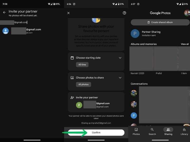 3단계: 이제 다른 Google 계정 (위에 입력한 계정)으로 이동하여 초대를 수락합니다. Google 포토 > 공유 에서 초대장을 찾을 수 있습니다 초대를 탭 하고 수락을 탭하세요 그러면 뒤로 공유 창이 열립니다 . 확인을 눌러 사진을 다시 공유하세요.