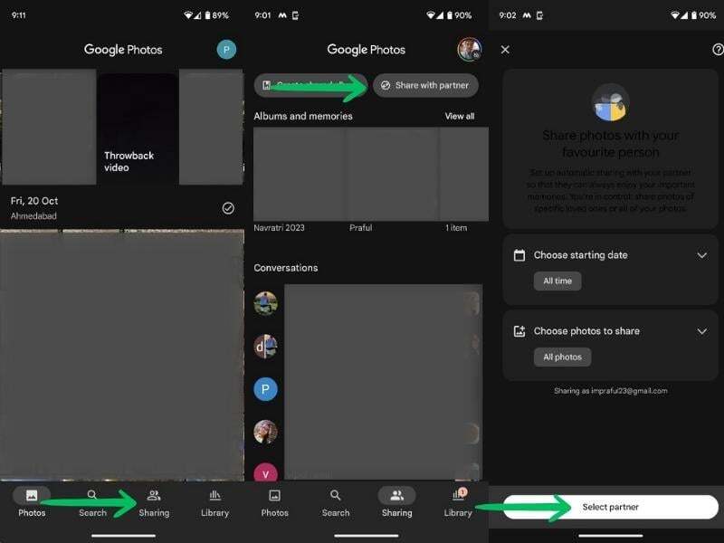 1단계: Google 포토 앱을 실행합니다 공유 로 이동합니다 파트너와 공유를 탭합니다 모든 사진을 공유하거나 특정 사람의 사진만 공유하도록 선택할 수 있습니다. 이제 파트너 선택을 탭하세요