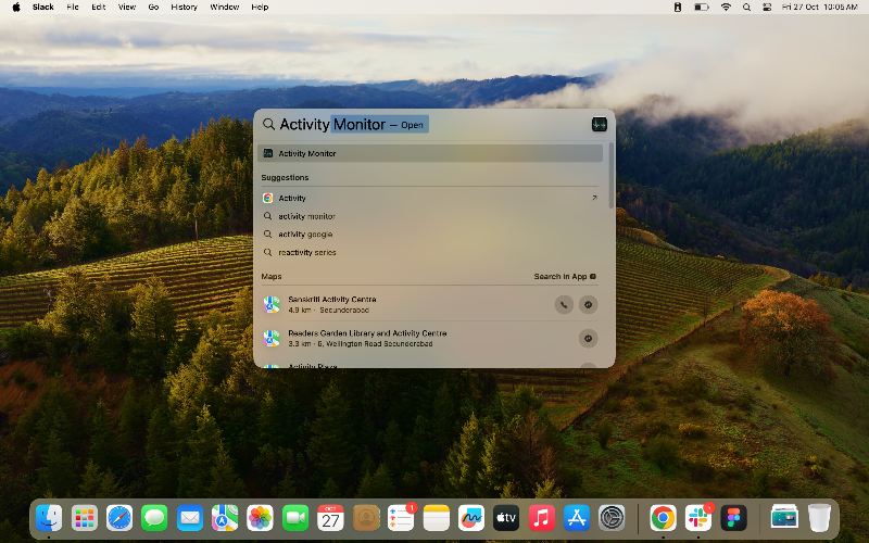 - 나타나는 Spotlight 검색 창에 Activity Monitor를 입력 하고 Enter 키를 누릅니다.