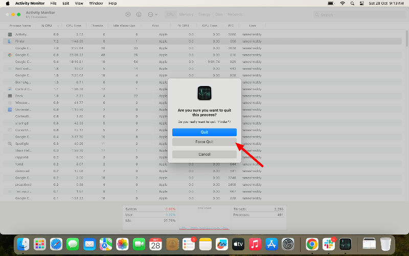 강제 종료가 도움이 되지 않으면 활동 모니터 에서 Finder 프로세스를 종료하십시오