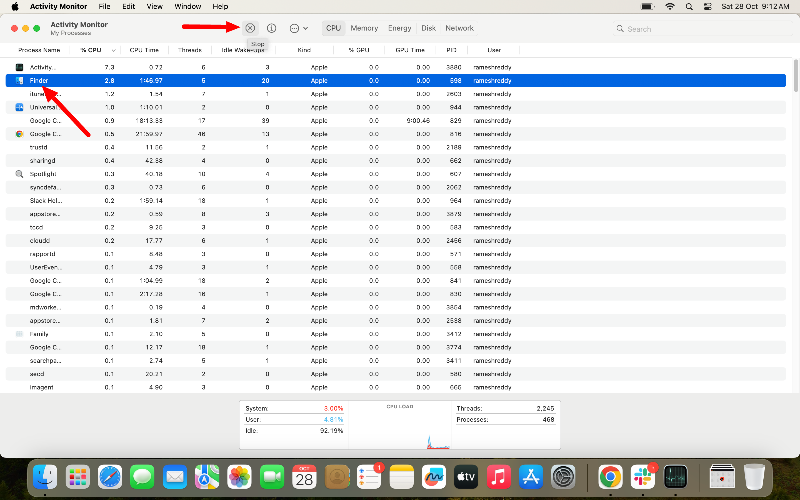 - Activity Monitor에서 실행 중인 애플리케이션 목록을 살펴보고 Finder 앱을 찾으세요.