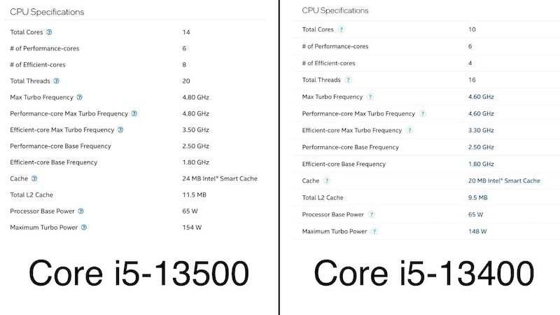 SKU/숫자 숫자는 프로세서 명명법의 마지막 3자리 숫자입니다. 이 마지막 숫자는 동일한 프로세서의 다양한 SKU를 비교하는 데 사용됩니다. 이를 더 잘 이해하기 위해 Core i5 13-400 및 Core i5 13-500 의 예를 들어 보겠습니다 둘 다 같은 세대의 동일한 i5 CPU이지만 Core i5 13-500이 Core i5-13400보다 우수합니다. 더 높은 주파수에서 더 많은 코어를 클록할 수 있으며 비용도 더 많이 들고 성능도 더 좋아집니다.