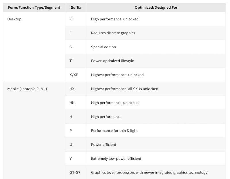 폼 팩터 및 TDP는 SKU 접미사와 동일함을 의미합니다. CPU의 TDP 값을 알고 이해하는 것이 중요합니다. 이를 통해 장치의 전력 소비 및 성능에 대한 아이디어를 얻을 수 있습니다. SKU 접미사/TDP는 프로세서 명명법에서 중요한 역할을 하며 이것이 어떻게 작동하는지 이해하고 싶습니다. 가장 효율적인 SKU 접미사부터 시작한 다음 더 강력한 SKU 접미사로 넘어갑니다.