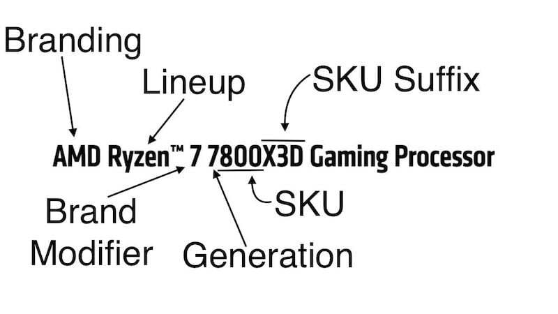 브랜드 수정자는 회사와 제품 라인의 브랜딩 뒤에 옵니다. Ryzen 7 7800X3D의 경우 왼쪽의 처음 7은 브랜드 수식어 또는 프로세서 시리즈 이름입니다. 인텔은 브랜드 수식어에서 문자 "i"를 접두사로 사용합니다. AMD는 모든 것을 정리했습니다. 그들은 단순히 Ryzen 3, Ryzen 5, Ryzen 7 및 Ryzen 9라는 숫자를 사용합니다. 숫자가 클수록 칩셋이 더 좋고 고급이므로 AMD CPU의 프로세서 명명법은 Intel보다 신규 사용자가 이해하기가 조금 더 쉽습니다.