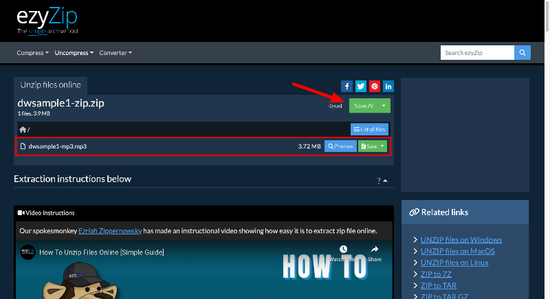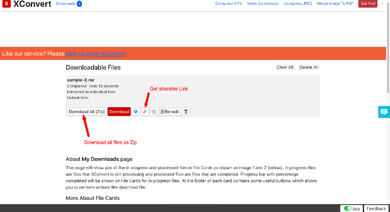 - 추출이 성공적으로 완료되면 파일을 볼 수 있습니다. 모두 하나의 zip 파일로 저장하고 다운로드 링크를 얻어 다른 사람들과 공유할 수 있습니다.