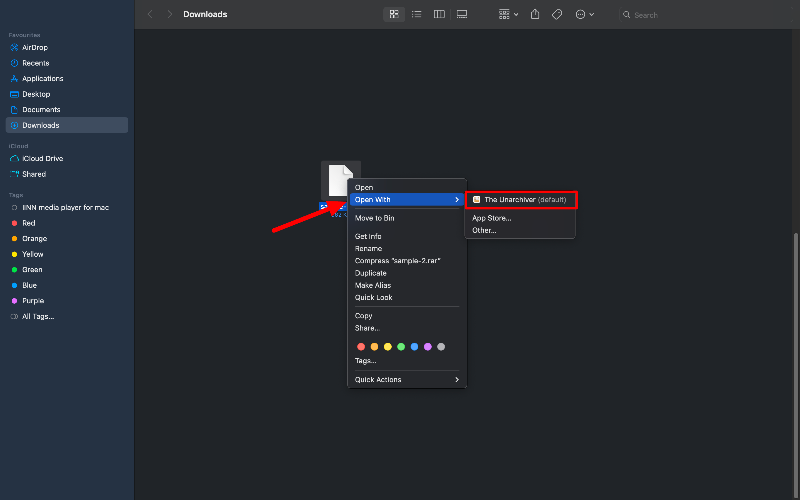 - RAR 파일을 마우스 오른쪽 버튼으로 클릭한 다음 "연결 프로그램"을 클릭하고 목록에서 Unarchiver를 선택 하거나 Unarchiver를 기본값으로 설정한 경우 RAR 파일을 두 번 클릭합니다.