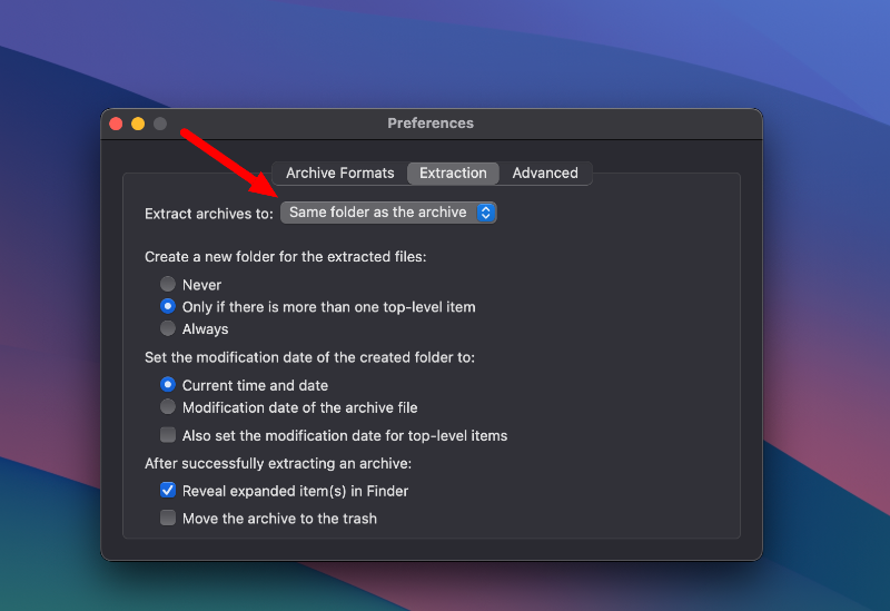 - Unarchiver가 추출을 처리하는 방법을 사용자 정의할 수 있습니다.