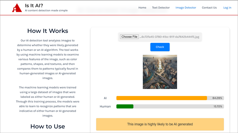 텍스트에서 이미지를 생성하는 도구뿐만 아니라 온라인에서 AI 이미지를 감지하는 도구도 있습니다. 여러분이 해야 할 일은 이미지를 업로드하거나 Hugging Face AI or Not Is it AI Detecting AI 등과 같은 도구에 링크를 붙여넣는 것뿐입니다. AI 생성 여부. 진위 여부를 명확하게 파악하려면 여러 도구를 사용하여 동일한 이미지를 확인해야 합니다. 때로는 틀릴 수도 있지만 AI 생성에 이미지가 너무 현실적으로 보인다면 시도해 볼 가치가 있습니다.