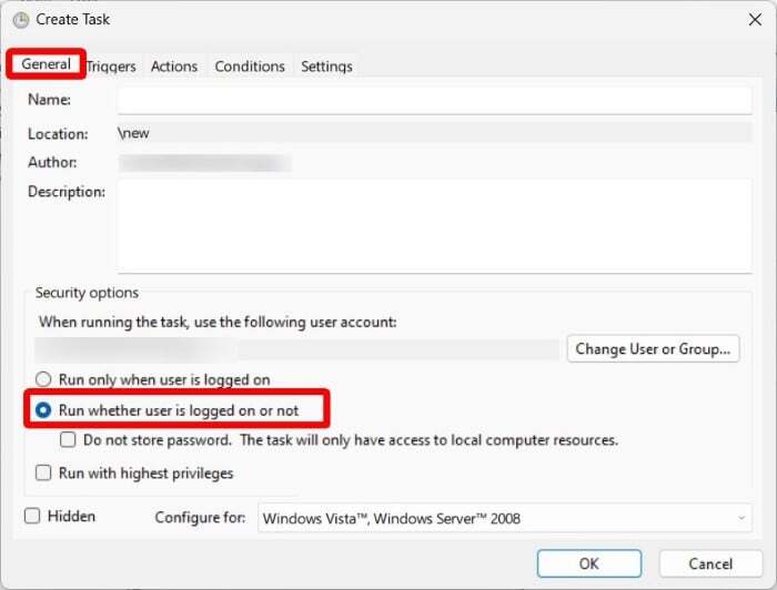일반 탭 의 보안 옵션에서 사용자 로그온 여부에 관계없이 실행 옵션 에 대한 라디오 버튼을 선택 하고 비밀번호 저장 안 함 확인란 이 선택 해제되어 있는지 확인하세요.