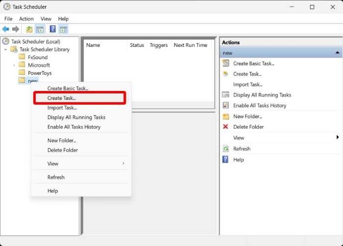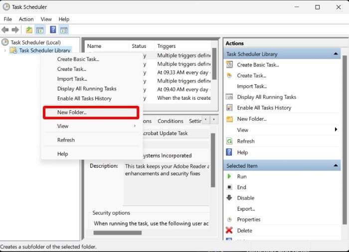 왼쪽 창에서 작업 스케줄러 라이브러리를 마우스 오른쪽 버튼으로 클릭 하고 새 폴더를 선택합니다