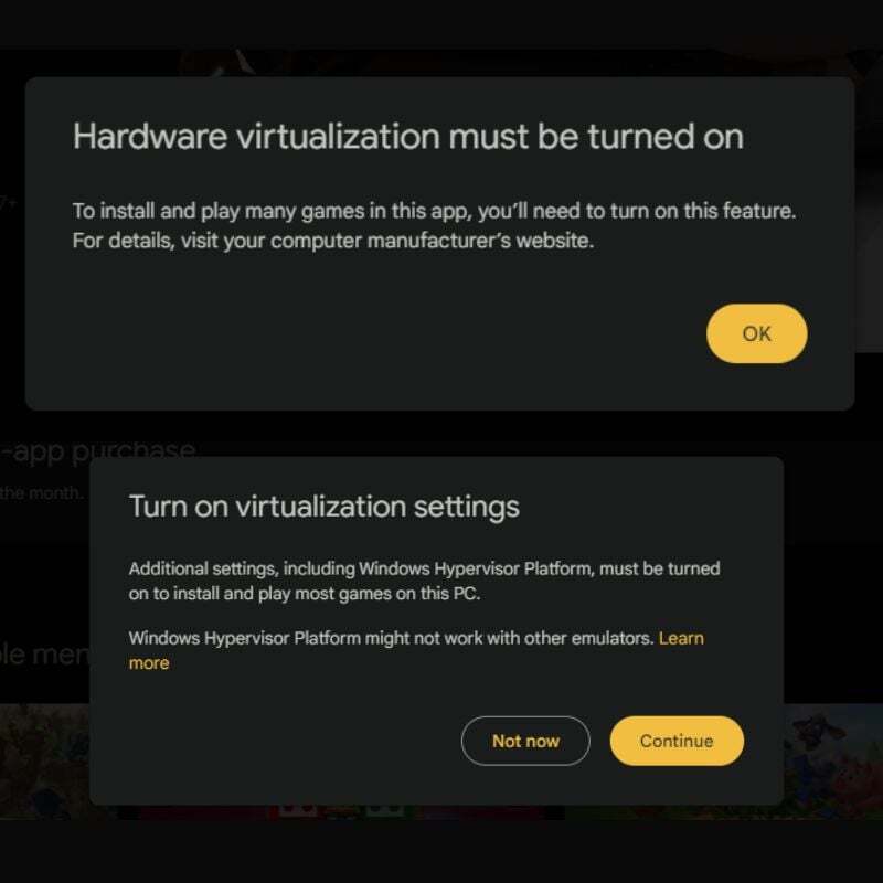 - Google Play 게임 홈페이지가 표시되면 게임 아래의 '설치' 버튼이 노란색으로 표시됩니다. 즉, 게임을 제대로 실행하려면 컴퓨터에서 하드웨어 가상화를 활성화해야 합니다. 화면에 이 작업을 수행하라는 메시지도 표시됩니다.