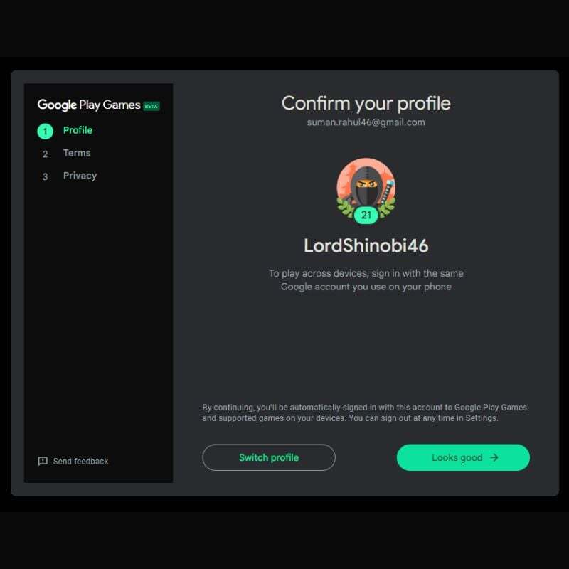 - Google 계정으로 로그인하면 Google Play 프로필이 로드되는 것을 볼 수 있습니다. 올바른 경우, 보기 좋음 버튼을 클릭하고 프로필이 두 개 이상인 경우 프로필을 전환하세요.